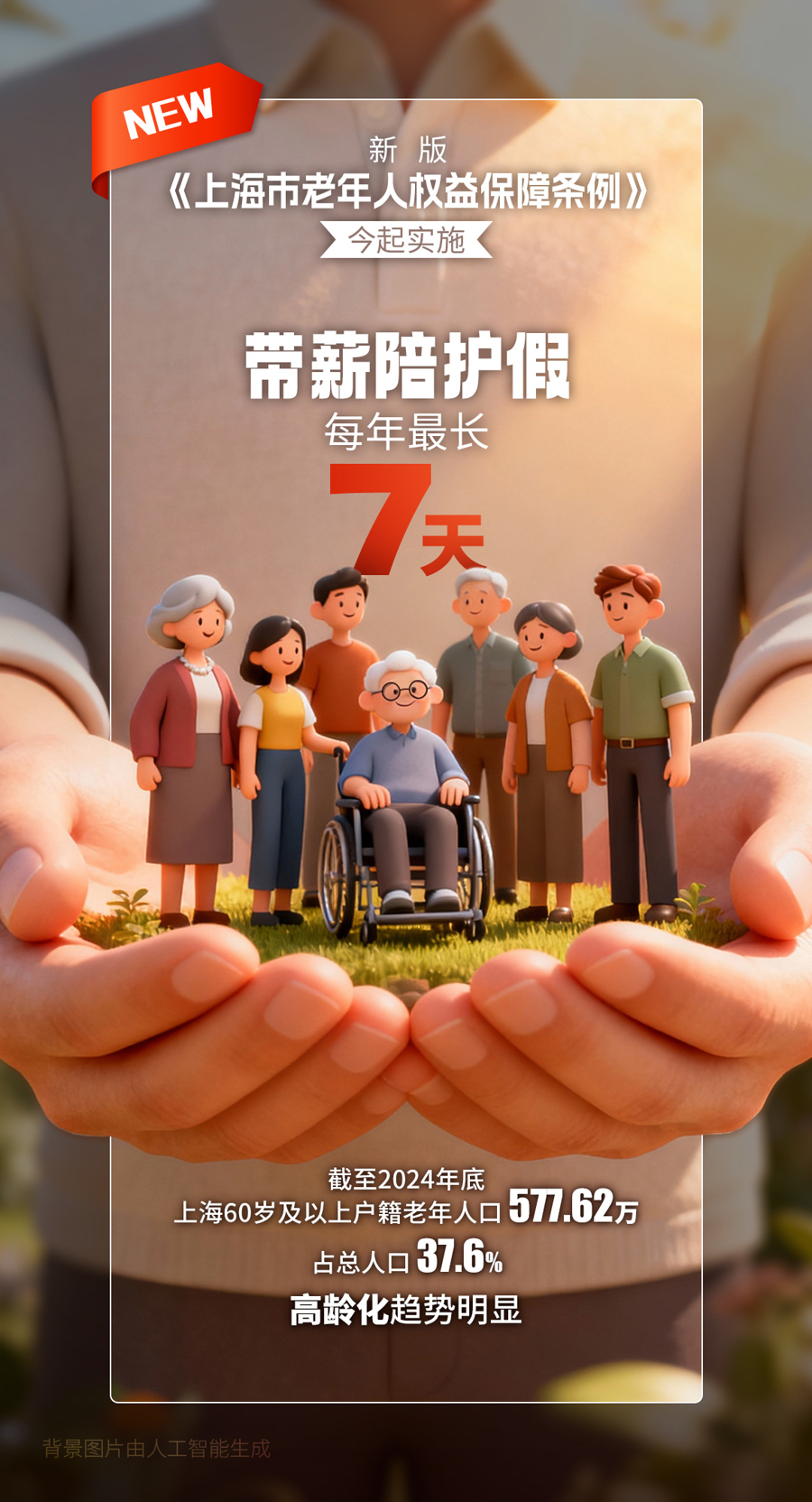 11月1日起,新修改的《上海市老年人权益保障条例》正式施行,明确了带薪陪护假独生子女最长每年可享7天。