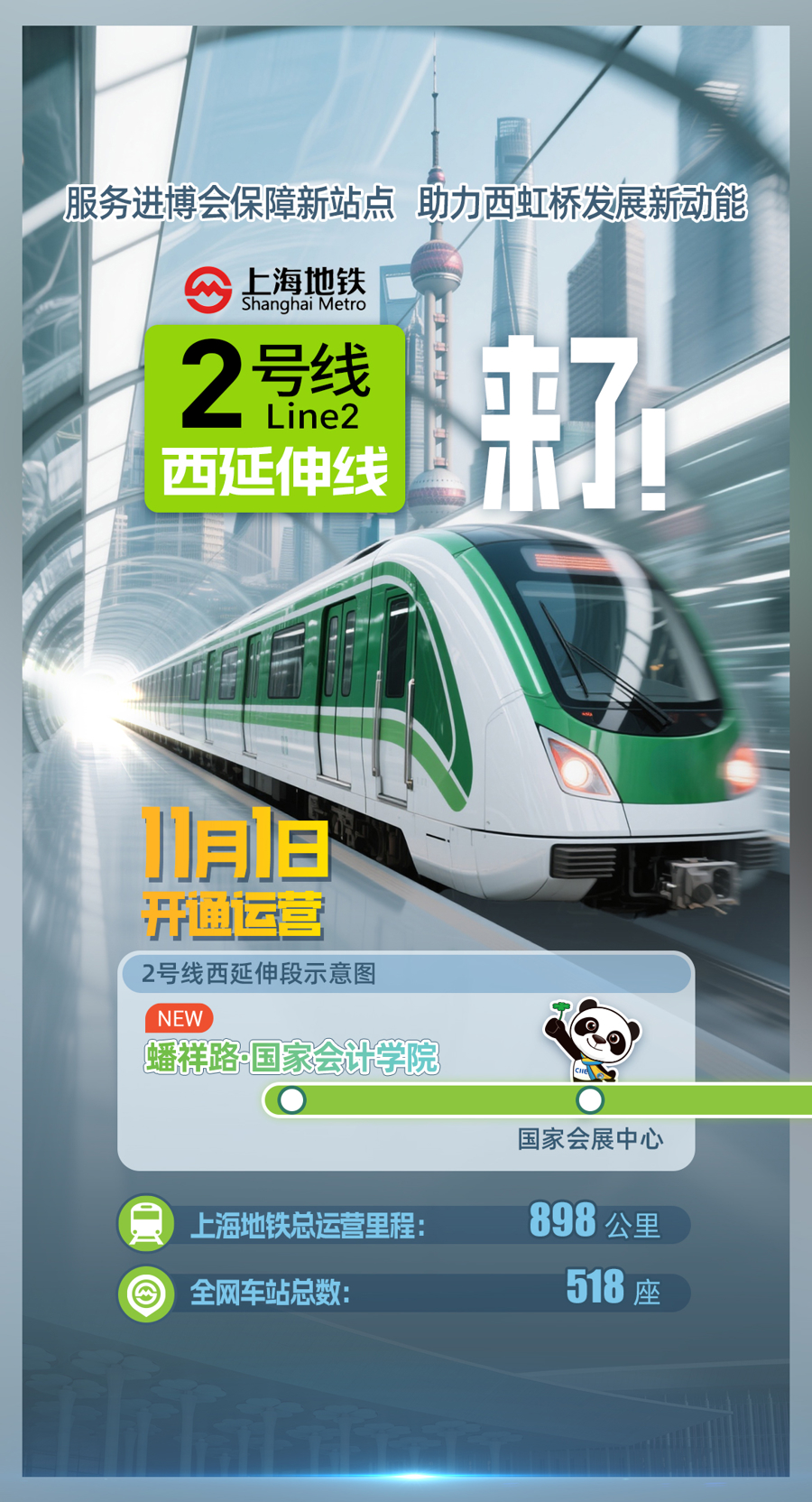11月1日起,上海轨道交通2号线西延伸工程蟠祥路·国家会计学院站开站运营,助力新一届进博会交通服务保障。
