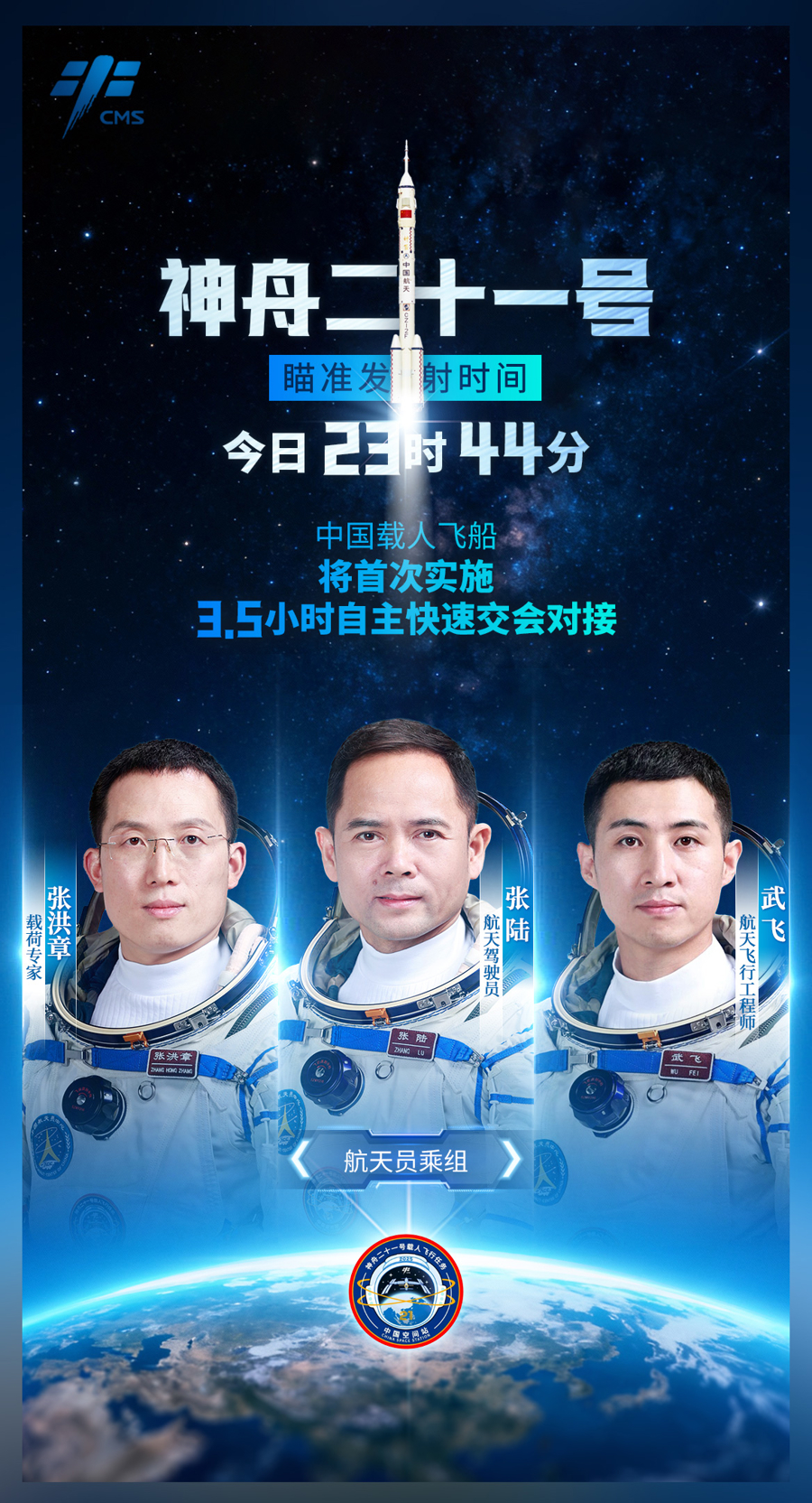 神舟二十一号载人飞船于10月31日23时44分发射,入轨后采用自主快速交会对接模式,约3.5小时后对接至天和核心舱前向端口,与空间站形成三舱三船组合体。航天员乘组由航天驾驶员张陆、航天飞行工程师武飞、载荷专家张洪章3名航天员组成。