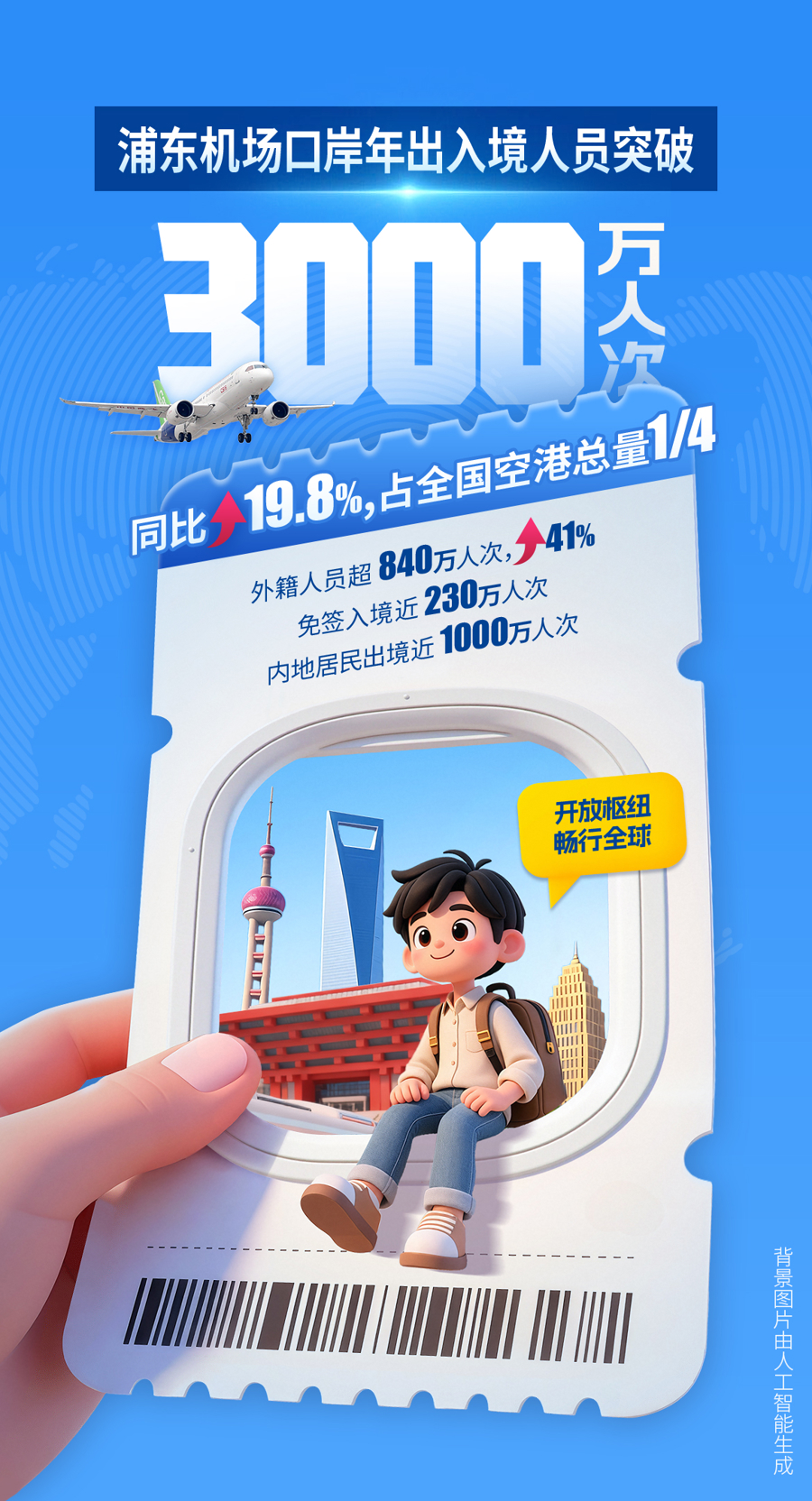 截至10月27日,上海浦东国际机场口岸年出入境人员总量突破3000万人次,同比去年增长19.8%,约占全国空港出入境人员总量1/4。