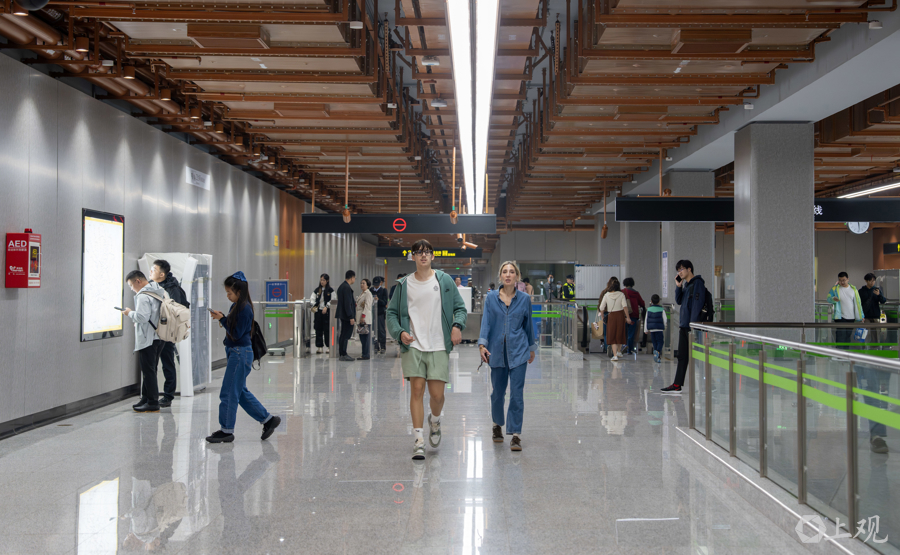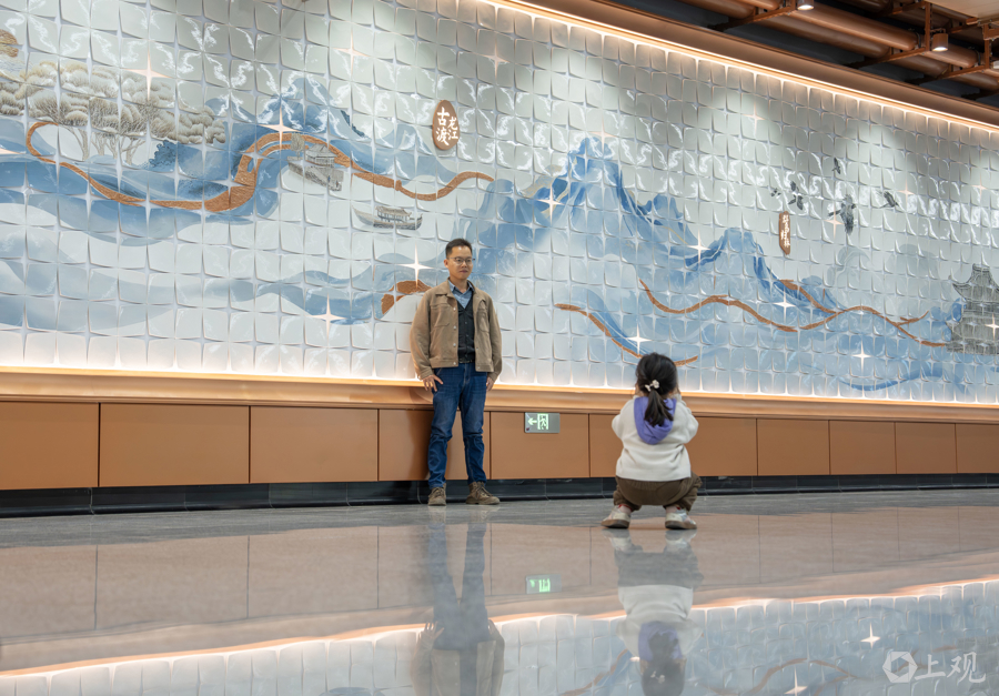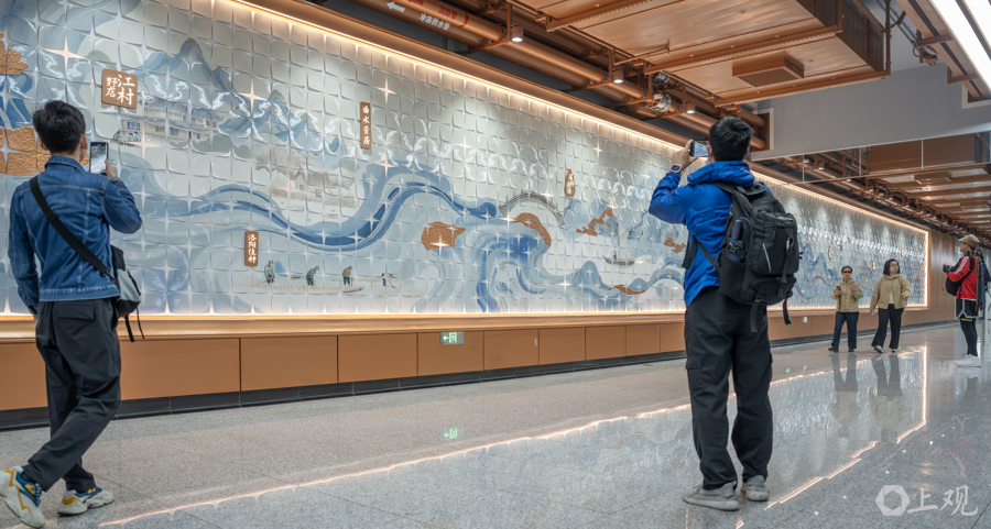 30米长的“蟠龙十景”公共艺术墙是站厅的“文化灵魂”,吸引了不少乘客留影。